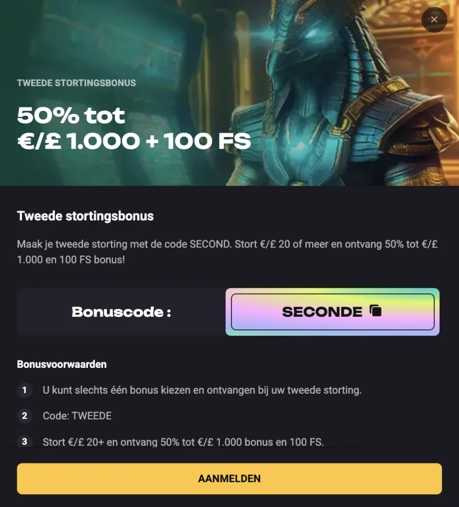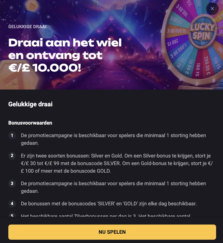 | Weekly Cashback | Krijg wekelijks 10% cashback, tot €500, op geld dat je in de voorbije week op slots ingezet hebt. | BACK10 |