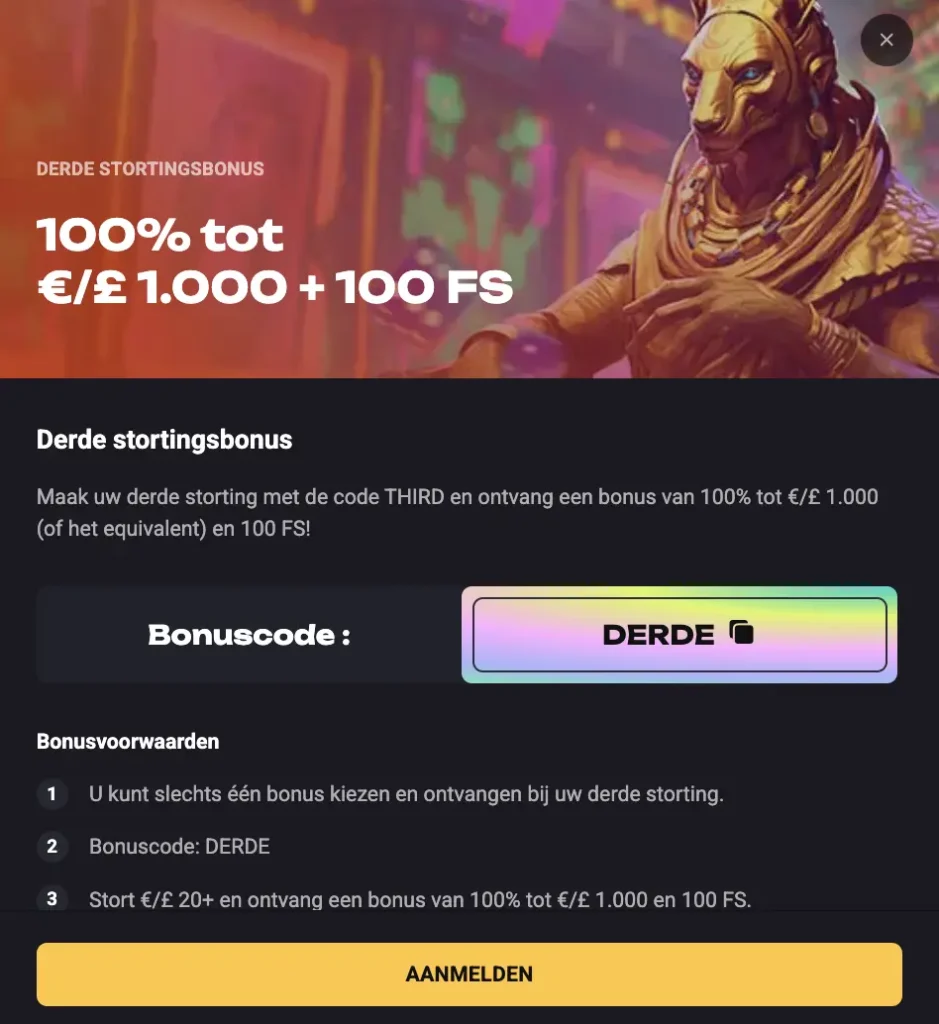 | Derde storting | 100% van je storting, tot €1000 als extra speeltegoed en tot 300 gratis spins voor Gates of Olympus 1000. | THIRD |